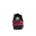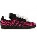 The Jeremy Scott Bones Pink adidas Campus 80s features an upper of leather covered in bright pink faux fur with black animalistic striping. Black leather is used to form the serrated 3-Stripes that run across the side panel. This same black leather is used for the heel tab, which sports white adidas trefoil branding. A faux fur tongue with long and wild fur at the top matches the laces and textile sock liner. A black rubber sole unit grounds this shoe, and the outsole features a herringbone traction pattern.