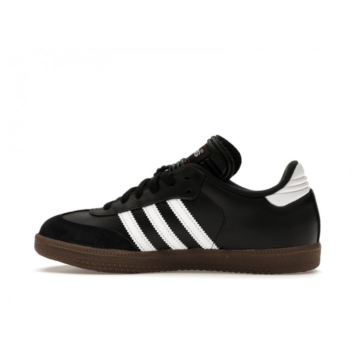 The adidas Samba Classic Black White Dark Gum (GS) has joined the iconic Samba line as a child-sized version of the original sneaker. This shoe features the gum sole and simple silhouette that made the original Samba so popular among indoor soccer players.