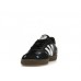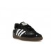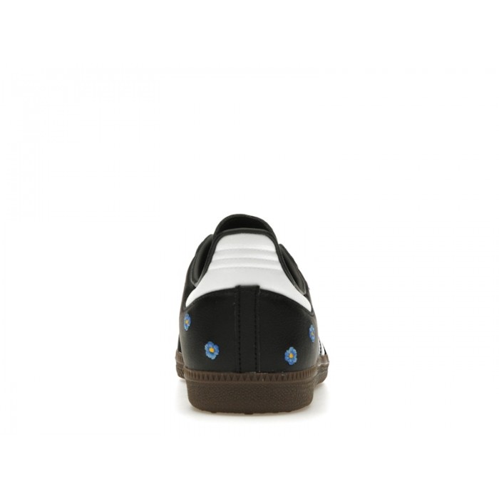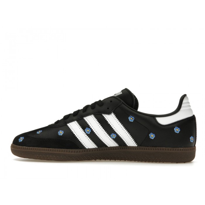This women's edition of the Samba shoes features a sleek core black leather upper, paired with a soft suede toe overlay in matching black for added texture. Crisp white serrated 3-Stripes and a ribbed heel tab bring contrast and classic branding. Scattered across the upper are embroidered light blue flowers with yellow centers, adding a whimsical charm to the otherwise minimalist design. Black laces and adidas branding on the tongue are classic design details. A gum rubber outsole grounds the look with vintage flair.