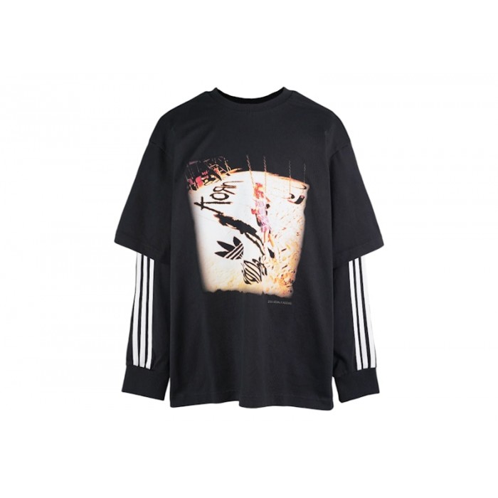 The adidas x KoRn Longsleeve Black is a Black t-shirt featuring a short-sleeved t-shirt silhouette over cuffed long sleeves, with the long sleeves accented by adidas’ signature 3-Stripes in white.adidas, the German athletic wear powerhouse, has been around since 1924, and their clothing and footwear have appeared on the likes of professional athletes and artists for decades. Bakersfield, California’s, KoRn, the nu metal band, heavily embraced adidas since their founding in the 1990s, and the band sported adidas wear from 1993 through 1997. The Longsleeve's artwork reimagines KoRn's self-titled debut album image with adidas branding. At the Black adidas x KoRn Longsleeve, the front features a screen-printed image of a girl on a playground swing with KoRn and the adidas Trefoil logo. The short sleeve and rear collar area display established 1994 and adidas branding in red embroidery.