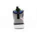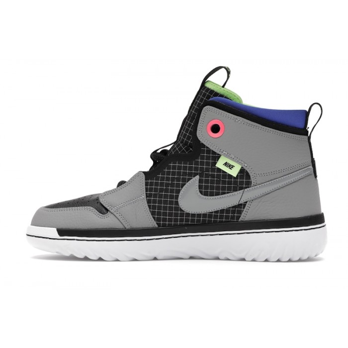 This shoe is a sleek and stylish Jordan 1 high silhouette brimming with many details. The black leather toe box is perforated and is surrounded by a particle grey tumbled leather toe cap and overlay. This leads to a grid pattern on the side panels and tongue of black nylon. A ghost green liner is topped with a racer blue collar that rocks. Notice the ghost green Nike tag on the medial side of the sneaker. A black and ghost green horizontal tag on the tongue also sports the words "JORDAN 1 REACT". A ghost green Jumpman icon is hidden underfoot in the React outsole.