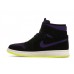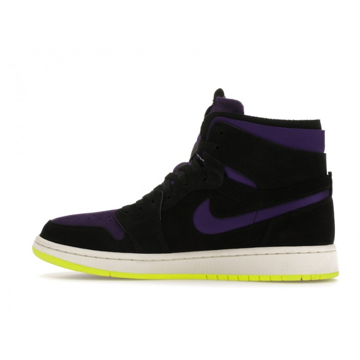 The Jordan 1 High Zoom Air CMFT Black Court Purple Lemon Venom (Women's) comes in women's sizes and has a black colorway with Court Purple and Lemon Venom accents.