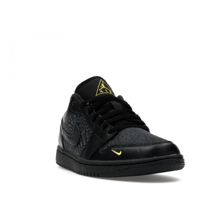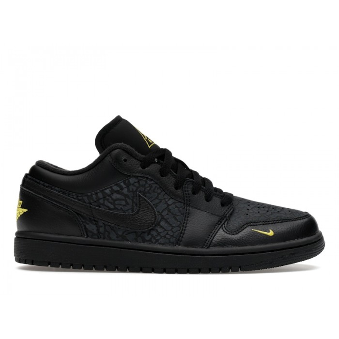 The Air Jordan 1 Low Black Elephant Print adds textured heritage to a timeless low top silhouette. Dressed in Black and Anthracite with hints of Tour Yellow, the upper features elephant print detailing that nods to classic Jordan design language. The familiar low cut shape and stitched overlays keep it grounded in the original 1985 blueprint.Elephant print has long been associated with iconic moments in Jordan history, and bringing it to the AJ1 Low creates a fresh yet nostalgic feel. The black base keeps the look sleek and versatile, while subtle yellow accents inject energy. It feels like a thoughtful remix that blends two legendary visual cues into one everyday rotation staple.