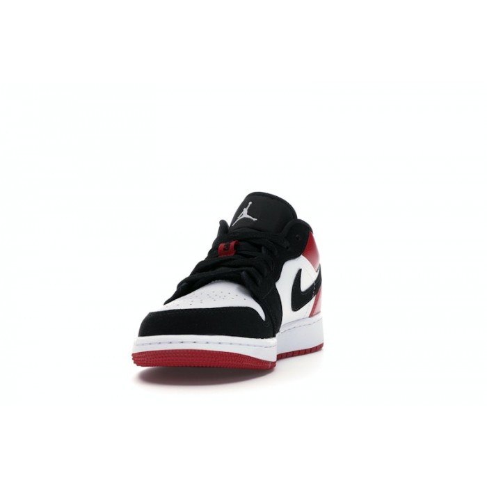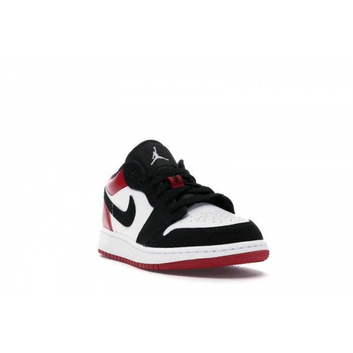 The Air Jordan 1 Low Black Toe GS features a White leather upper highlighted by a Black Nubuck mudguard wrapping around the foot and a Gym Red collar and heel counter. A white Jumpman logo is embroidered on the tongue, while a tonal Wings logo is stitched onto the heel. The heel uses an Air-Sole Unit. The shoe is completed with a white midsole and red outsole.
