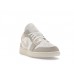 This Air Jordan 1 model features a classic gum rubber sole and midsole. The body of the shoe is primarily composed of a mixture of leather and suede. The base color is bright white, with the overlays being a light taupe, tan, and gray. The Nike ‘Swoosh’ is a light tan as well.