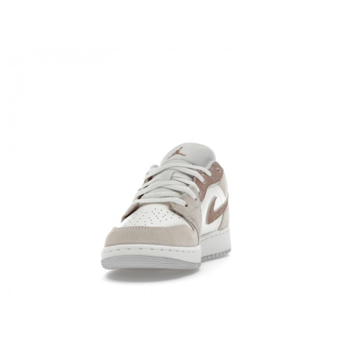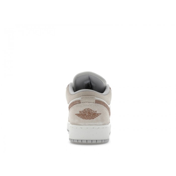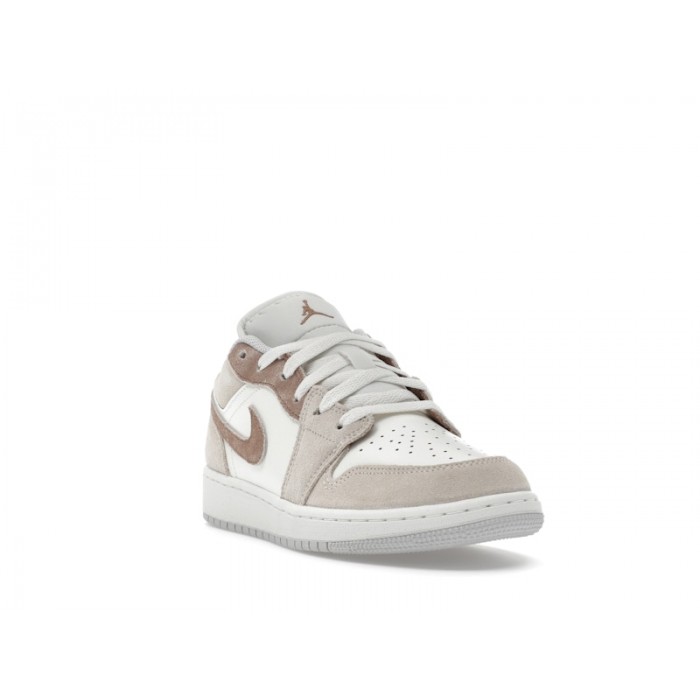 The Legend Light Brown (GS) Jordan 1 Low SE has an upper made of leather and suede. A cream leather base forms the sides and perforated toe box, while suede overlays in light brown form the toe box, bottom two eyestays, heel counter, and ankle. A darker brown makes up the suede that forms the Nike Swoosh on each side, as well as the top eyestays. An Air Jordan logo is stitched into the heel, and the tongue also bears branding elements. The shoe has an off-white midsole and a light-gray outsole.