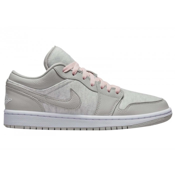The Jordan 1 Low SE Light Iron Ore (Women’s) is a low-top basketball shoe that comes in a sleek and crisp light gray colorway with White Atmosphere and soft pink accents.