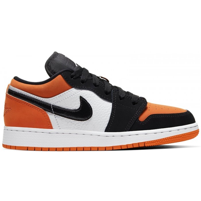 The Air Jordan 1 Low Shattered Backboard (GS) is a low-top Grade School edition Air Jordan 1 sneaker in a Black/White Starfish colorway.