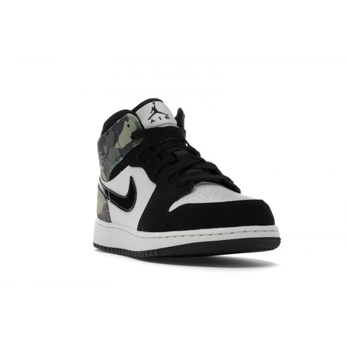 The Camo Jordan 1 Mid for grade-schoolers features a combination of suede, leather, and canvas materials on its upper. The sneaker features the signature Air Jordan Wings logo on the collar. The shoe's mid-top design provides ankle support and stability, also including a padded collar to ensure comfort. Furthermore, the sneaker's cushioned midsole offers responsiveness and comfort, while the durable rubber outsole provides traction and grip. The shoe features a lace-up closure system that allows for a secure and customized fit. In addition, a Nike Swoosh is displayed on the shoe's sides, while the tongue features a "Jumpman AIR" insignia.