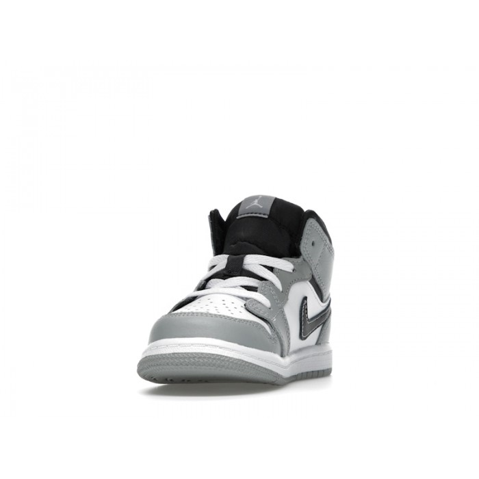 The Jordan 1 Mid Light Smoke Grey (2022) (TD) recreates the classic 1985 mid-top silhouette in a gray, black, and white colorway. This shoe specifically sized for toddler-age kids adds a detail specifically for them.