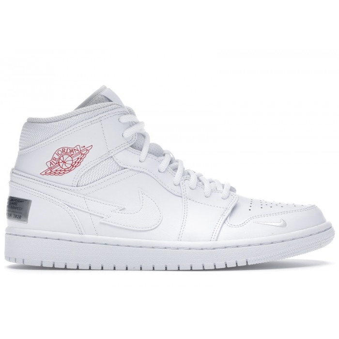 The Jordan 1 Mid SE Nike Swoosh On Tour (2020) features a White and Gym Red leather and mesh upper with stark white paneling acting as the base. From there, "Air Jordan" logos in Gym Red dot the upper, small versions of the Nike "Swoosh" add to the toebox, and a larger side "Swoosh," modified to resemble a bolt of lightning, complete the design.