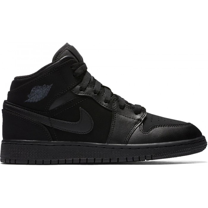 The Jordan 1 Mid Triple Black (2016) (GS) is a sneaker made in grade school size with a mid-top silhouette and a monochromatic color scheme.