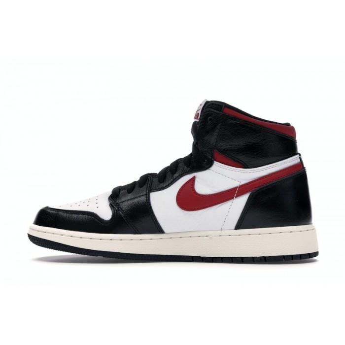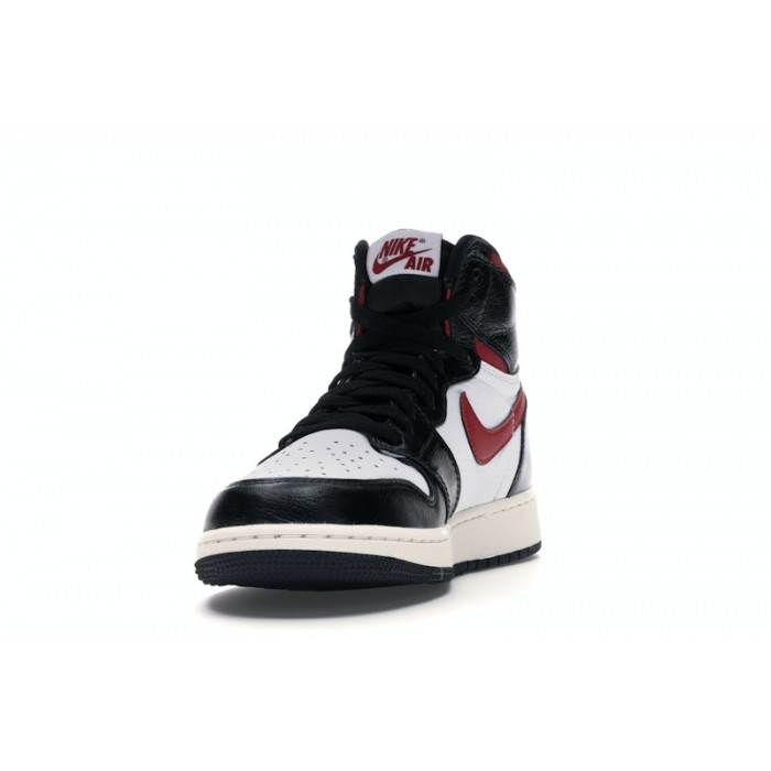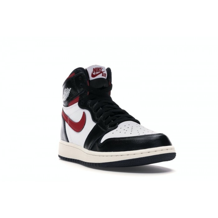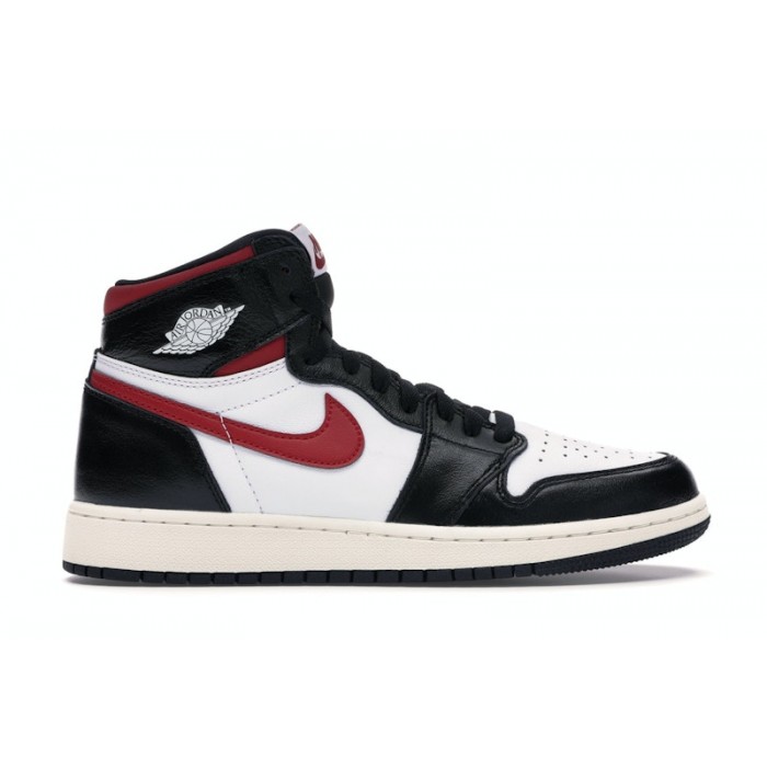 The Jordan 1 Retro High Black Gym Red Kids features a white, black, Gym Red, and Sail leather upper, with the crisp white underlays landing in stark contrast to the somewhat glossy black overlays wrapping the toe, heel, eyestays, and collar of the shoe. From there, Gym Red that pops out on the ankle, Nike "Swoosh" logo, and the "Nike Air" lettering on the tongue badge and a Sail midsole over a black outsole complete the design.