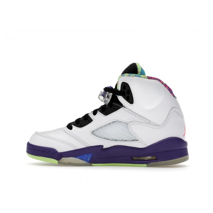 The Air Jordan 5 Retro Alternate Bel Air GS draws its influence from the 2013 Jordan 5 Bel-Air. The color scheme of these sneakers includes white, court purple, and racer pink.