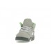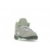 The shoe retains most of the signature Air Jordan 5 design elements such as the mesh panels on the sides and shark teeth details on the midsole. It has a grey upper made from leather material while the midsole is black and the outsole showcases an icy blue hue. The shoe also has vibrant lime green accents around the collar lining and on the shark-teeth details which help to add a touch of color to the shoe’s design. Branding elements on the shoe include an embroidered Jumpman logo on the tongue and heel area.