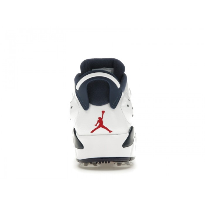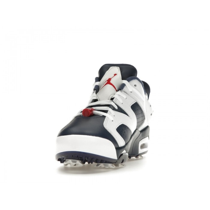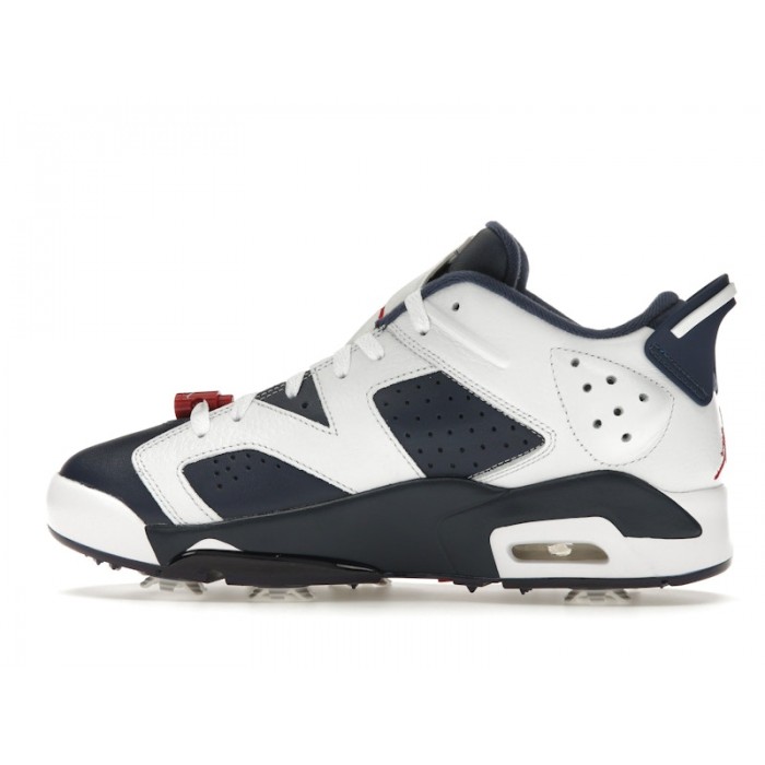 The Jordan 6 Low Golf Olympic brings the iconic Air Jordan 6 silhouette to the golf course with a patriotic twist. This men's golf shoe features a clean white leather upper accented with varsity red and midnight navy details, paying homage to the colors of the American flag. The low-top design offers enhanced mobility on the green, while maintaining the classic Jordan 6 look with its distinctive side panels and visible Air unit in the heel.