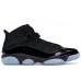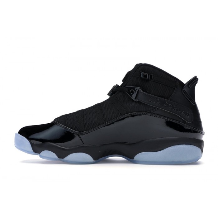 The 6 Rings Air Jordans by Nike showcase a ballistic mesh upper in black tones with matching patent leather accents on the heel and mudguard. The sneaker also boasts a toggle lacing system with an integrated buckle strap, an icy translucent outsole, and a cushioned midsole for support. The sneaker has a black ice colorway that features a black upper with a ballistic mesh construction on the tongue and side panels.