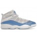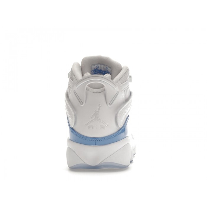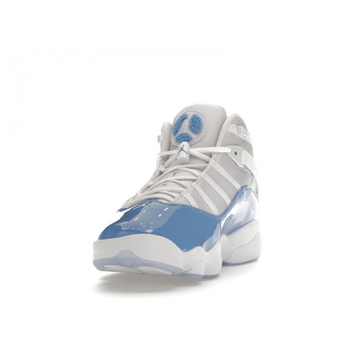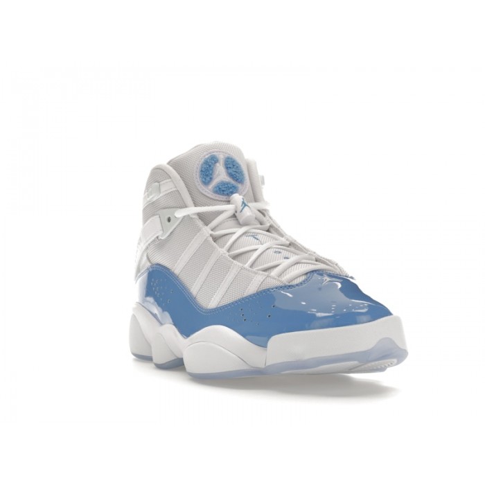 In tribute to the University of North Carolina, the Air Jordan 6 Rings UNC sneakers deliver a playful yet slick high-top shoe for your best ball and sneaker game.Inspired by the color scheme behind UNC, these basketball sneakers join the Air Jordan 6 camp of high-tech, super stylish shoes. With a white and grey mesh base, a powder blue patent leather detail pops. The iconic Jumpman logo of the Air Jordan brand sits embroidered on the tongue inside a blue fleece patch. The TWO3 branding sits along the forefoot. At the back heel sits an embossed Jumpman logo, while the Air Jordan text brands two backward-facing Velcro straps that cross over the lace enclosure of the ankles. Midsoles provide thick cushioning for that extra leap.