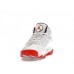 The white upper is crafted from leather, synthetic leather, and textile, which matches the tonal laces, part of the tongue, the Jumpman logo near the toe, and most of the midsole. The patent leather mudguard, the insole, and the laces toggle come in black, while red accents can be found on the outsole, the upper eyelets, and the tongue’s Jumpman logo. The heel and forefoot house Zoom Air units, providing responsive cushioning without weighing down the foot. Overall, the sneaker has a lightweight build and showcases plenty of classic Jordan branding.
