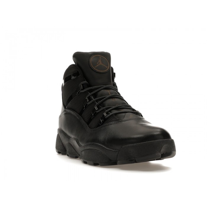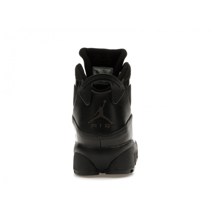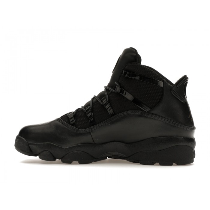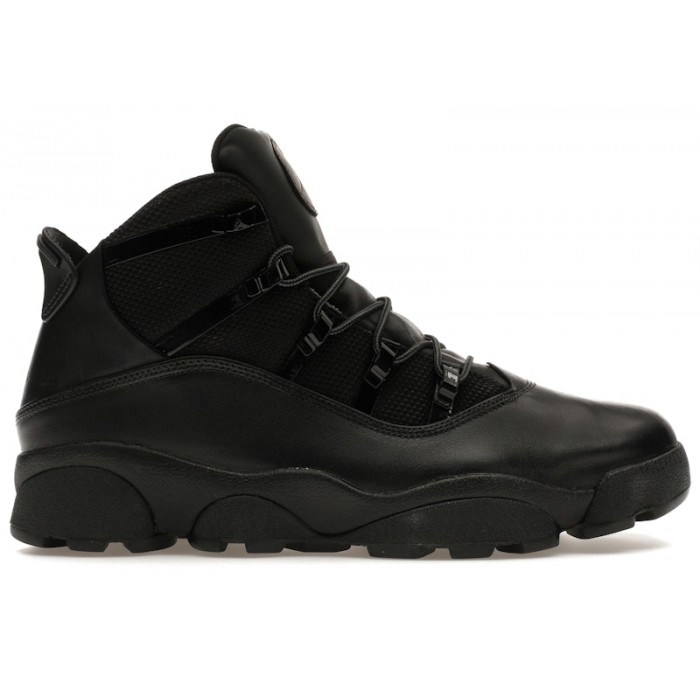 The Jordan 6 Rings Winterized Black (2023) offers an all-weather version of the iconic silhouette that fuses elements from different Air Jordans in order to pay homage to MJ's 6 NBA championships.The Winterized Black iteration of the Jordan 6 Rings features an upper crafted from black ballistic mesh. This is overlaid with water-resistant black leather at the toebox, mudguard, and heel. Black rope laces thread through sturdy metal eyelets that stem from long metal eyestays to provide a secure fit across the entire foot. The black foam midsole encapsulates Air for cushioning, while the black rubber outsole is deeply grooved for all-weather, all-terrain traction.