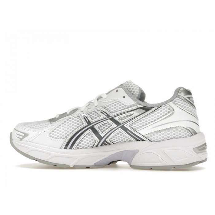 The ASICS Gel-1130 White Carrier Grey Lilac (Women's) is a stability running shoe with a white base and crisscrossing overlays in Carrier Grey and white.