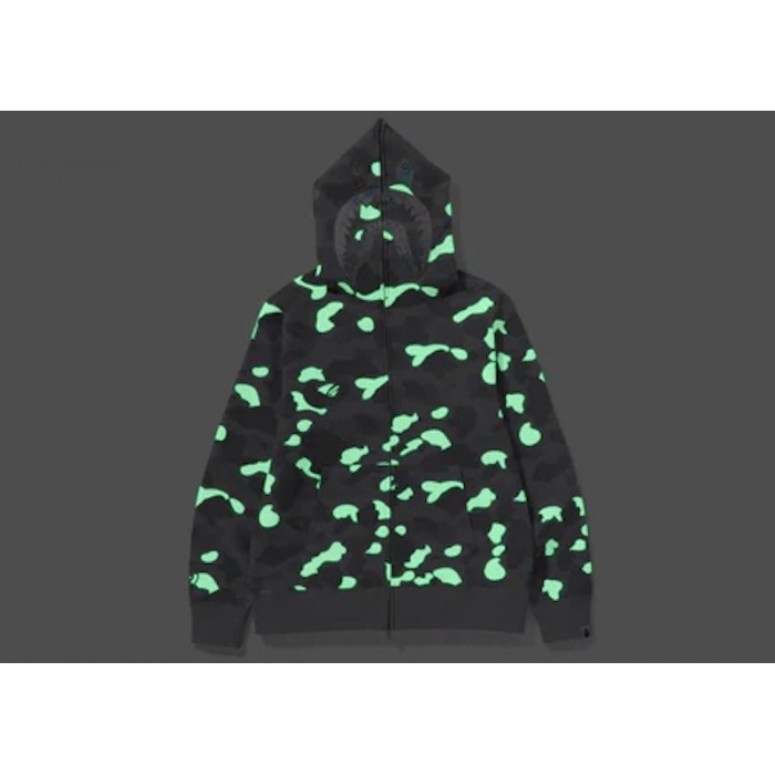 Get urban threads done right with the BAPE City Camo Shark Full Zip Hoodie (SS24) Gray. This edgy hoodie is the epitome of forward-thinking Japanese streetwear with iconic global appeal.This unique hoodie from BAPE delivers comfort and style in one on-trend garment. A popular icon on the BAPE range of clothing, the shark face sits on the head of the hoodie, perfectly split by a zipper that runs from hem to head for full closure. In gray and white camo patterning, this variation has glow-in-the-dark embellishments in the white paint. With a kangaroo pouch pocket in the front and a relaxed fit, this Bathing Ape top will be a great addition to an urban-centric wardrobe.