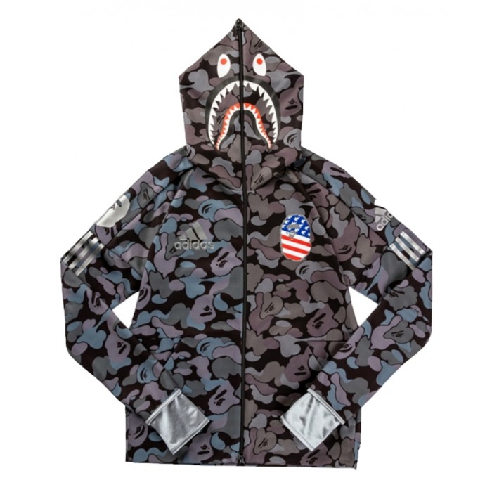 BAPE and Adidas have come together again for a small collection of football gear, but this time it’s the American kind. Releasing apparel, accessories, and footwear; the collection features Shark Hoodies, jerseys, cleats, Ultra-boosts, tights, gloves, a helmet, and a football. This grey shark hoodie features a classic BAPE camo pattern as well as the shark graphics on the hood with an American Flag BAPE logo and silver adidas logo on the chest. The collection was released in honor of the 2019 Superbowl in Atlanta and dropped only one day before, releasing on February 2nd, 2019. The hoodie retailed at $250 USD.Основные характеристики BAPE x Adidas SB Shark Hoodie Black