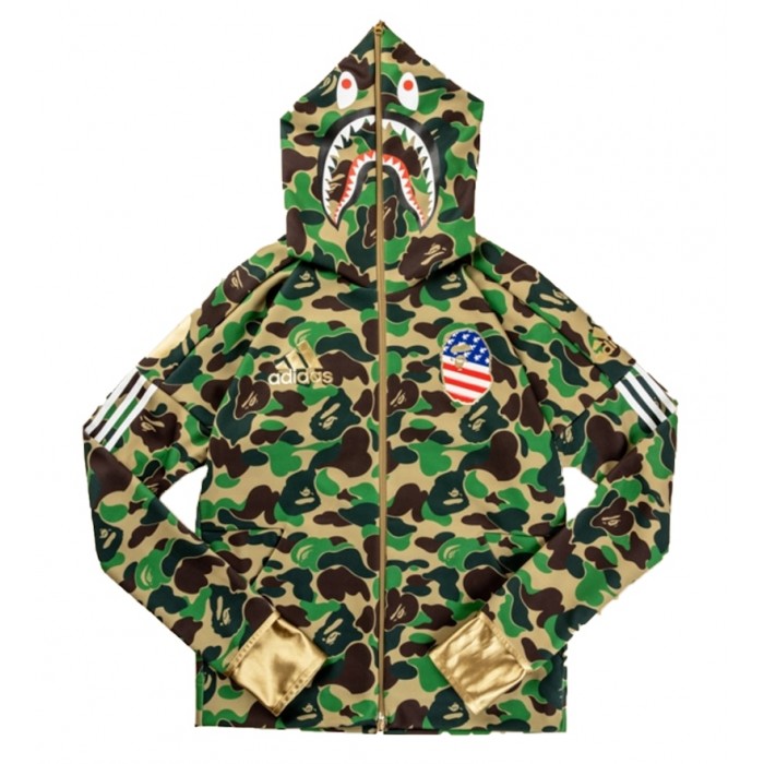 BAPE and Adidas have come together again for a small collection of football gear, but this time it’s the American kind. Releasing apparel, accessories, and footwear; the collection features Shark Hoodies, jerseys, cleats, Ultra-boosts, tights, gloves, a helmet, and a football. This green shark hoodie features a classic BAPE camo pattern as well as the shark graphics on the hood with an American Flag BAPE logo and golden adidas logo on the chest. The collection was released in honor of the 2019 Superbowl in Atlanta and dropped only one day before, releasing on February 2nd, 2019. The hoodie retailed at $250 USD.Основные характеристики BAPE x Adidas SB Shark Hoodie Green