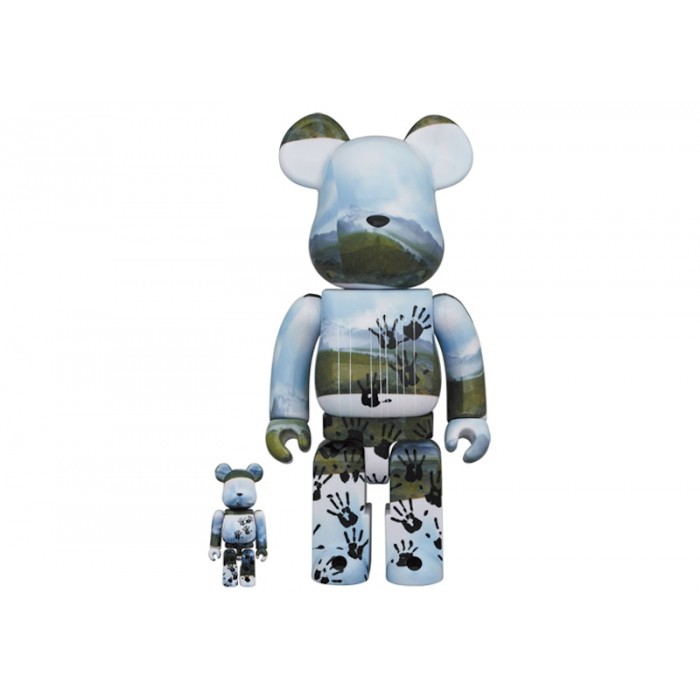 The Bearbrick Death Stranding 100% & 400% Set includes two Brickbear figures: one measuring 2.75 inches tall and the other 11 inches tall. Both Bearbricks pay tribute to Death Standing, a post-apocalyptic video game released for PlayStation 4 in 2019.Both figures are crafted from durable, high-quality plastic and feature moveable arms and legs. The front of each figure displays a mural of a green landscape with puffy clouds, while the back reveals a desolate, gray environment. Black handprints cover the front of the Bearbricks, representing the marks ghosts leave on protagonist Sam Porter as they try to pull him to the land of the dead. Like other Bearbricks, these models have over-sized heads, anthropomorphized bodies, and long legs.
