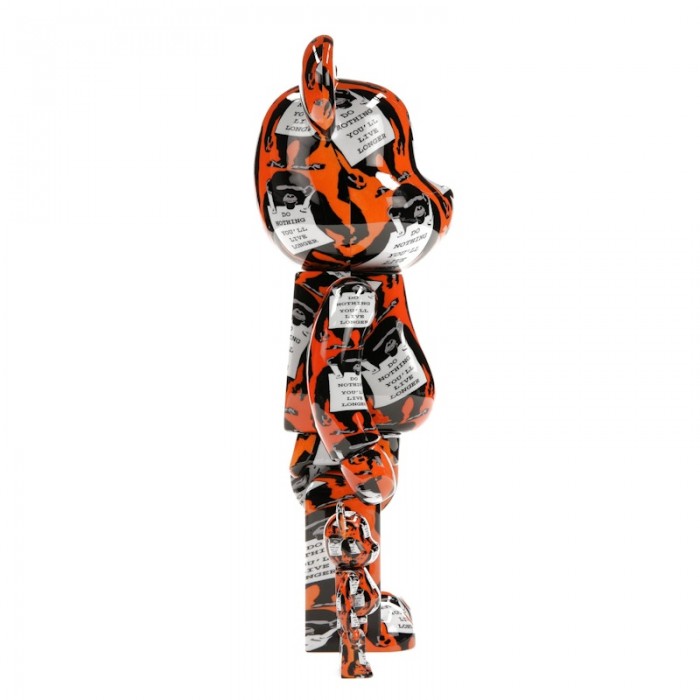 The Bearbrick Monkey Sign 100 400 Set Orange is a collectible item that came to the market as a result of a collaboration between Medicom Toy partners and Brandalism.The Bearbrick Monkey Sign is orange in color and has a bear-like figure. The figure has an all-body pattern with the famous artwork from the legendary artist, Monkey Sign, repeated multiple times with writing reading, "Do nothing you’ll live longer." The figure is 28cm tall and is made from PVC.