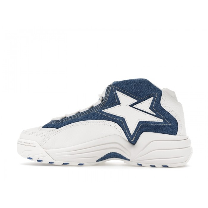 Ключевой элемент модели — верх из denim‑материала. Он имитирует структуру традиционного джинса, добавляя обуви характерную текстуру и ощущение лёгкого винтажного, «разношенного» стиля по мере эксплуатации. Дополнительные кожаные детали, включая крупный белый стрелovidный логотип star на боковых панелях и элементы в зонах повышенного износа, повышают долговечность и визуально выделяют силуэт. Внутренняя отделка ориентирована на комфорт, сочетая мягкость и поддержку стопы.