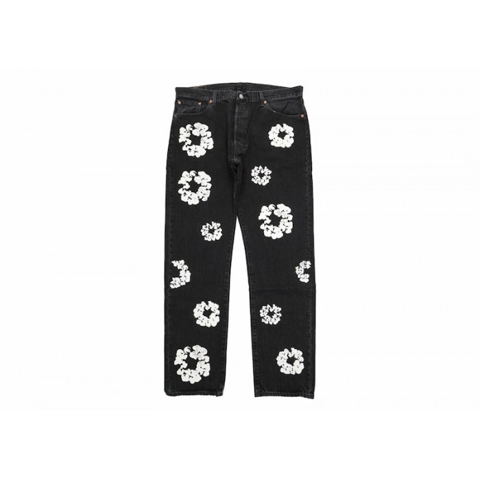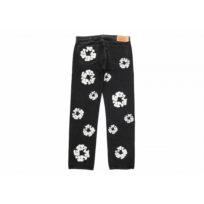 The Denim Tears X Levi's Cotton Wreath Jean Black is a product of a collaboration between Denim Tears and Levi's.The Black Denim Tears X Levi's Cotton Wreath Jean features a Cotton Wreath embroidery detailing throughout, which is done in a white color. The front of the jeans has two pockets, while the backside has one more pocket. The pants also have sturdy stitching and reinforced seams. They also include a zipper fly and a button closure. Additionally, the waistband of the jeans is fitted with belt loops that allow you to adjust the waistband to your specifications. The pants also have tapered legs and have a Levi's Red Tab at the back of the waistband.