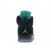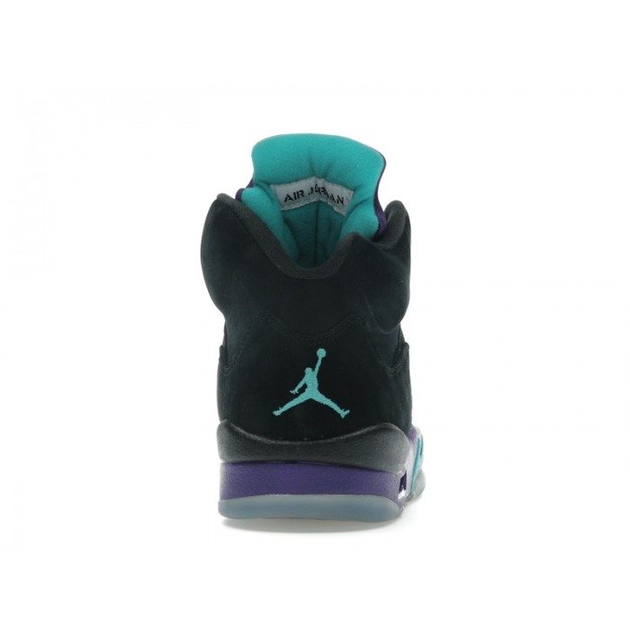 This 2013 Air Jordan 5 Retro shoe has a black nubuck upper with New Emerald and Grape Ice highlights. The midsole of this shoe stands out with purple and turquoise accents, while the iconic shark-tooth detailing of the Air Jordan 5 adds contrast against the Ice-Blue outsole. This sneaker comes with a black lacing system that finishes its look. This sneaker also features Nike's signature Air cushioning technology. The midsole of the shoe incorporates Air-Sole units, which are pockets filled with pressurized air. The technology used in crafting the upper part of this sneaker involves a combination of synthetic materials, such as synthetic leather, mesh, and nubuck.