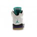 The shoes have a white leather upper complemented by a touch of black around the collar lining, some hints of purple on the tongue and midsole, and very subtle teal accents on banding and decorative details. They retain the majority of the Jordan 5 signature design elements, including the mesh paneling on the sides, shark-teeth detail on the midsole, and visible air unit in the heel.