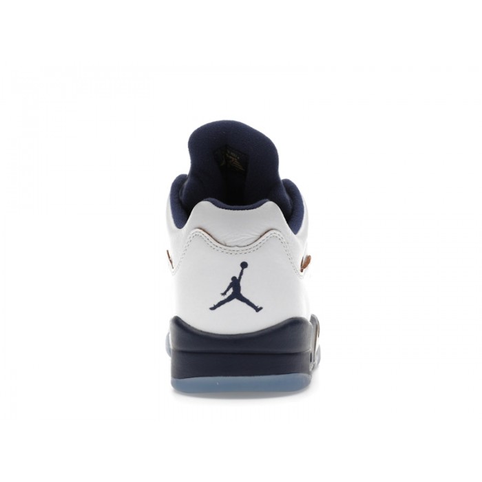 The Dunk From Above colorway features a predominantly white color scheme with Metallic Gold accents and shades of Midnight Navy for added contrast. It retains the classic Jordan 5 design elements like a lace lock system, a shark-tooth design on the outer midsole, and mesh panels on the sides. As for branding, the shoe has a Jumpman logo on the tongue and another on the heel.