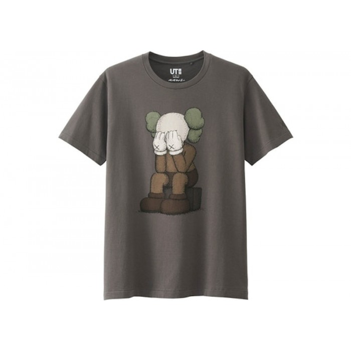 The KAWS x Uniqlo Passing Through Tee (Asia Sizing) Brown is an eye-catching T-shirt that represents a collaboration between KAWS, the artist known for his avant-garde whimsy, and Uniqlo, a Japanese fashion brand known for its casual wear for men, women, and children. This tee originally debuted in Spring/Summer 2016 as a part of Uniqlo’s UT collection, a subset of the brand that celebrates pop culture from all over the world.The brown KAWS x Uniqlo Passing Through Tee (Asia Sizing) is made from all cotton with short sleeves, a crew neck, and a length that extends to approximately mid-hip. The graphic emblazoned across the front of the shirt is a KAWS drawing of a clown-like figure with tufts of green hair sitting on a box and covering their face with white-gloved hands.