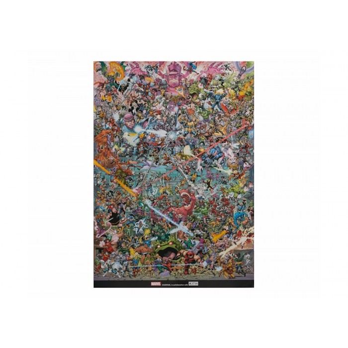 The Kith x Marvel Cinematic Universe Poster Multi is a poster designed as a collaboration between the two brands, featuring custom artwork of the Marvel Universe.This iteration of the Kith x Marvel Cinematic Universe Poster is 17.6 inches wide and 27.75 inches tall. The multicolored poster features hits of pink, green, blue, yellow, and all the colors in between, while Marvel characters dominate the entire poster. They appear in front of a building that is barely visible because the poster is so crowded with characters fighting each other. The poster features Marvel and Kith branding at the bottom, and it has a glossy finish.