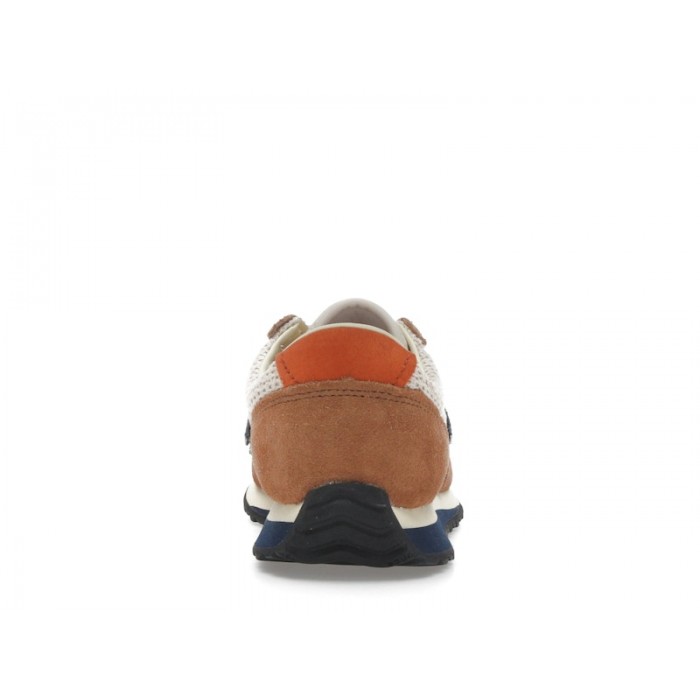 Верхняя часть кроссовок выполнена из комбинации премиальных материалов, делая акцент на текстуру. Основа представлена кремовым плетеным материалом, вдохновленным кроше, обеспечивающим дышащие свойства. Накладки из коричневой замши, а также тыквенно-оранжевые акценты burnt orange на пятке, придают глубину и осенний характер. Темно-синий джинсовый логотип 'N' на боковой стороне и уникальная "Fang" накладка на носке, заимствованная из архивных моделей, дополняют образ. Классический резиновый протектор с herringbone-рисунком на аутсоли обеспечивает надежное сцепление.