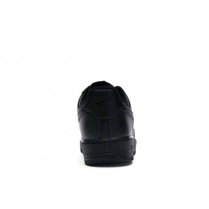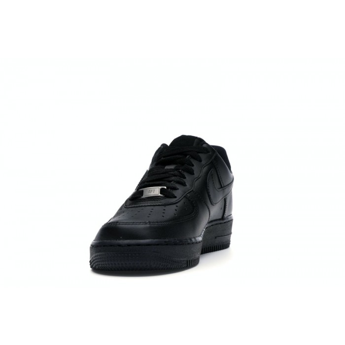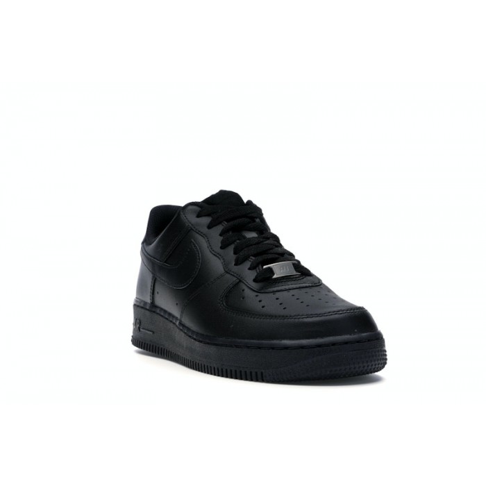 The Nike Air Force 1 Low '07 Black features a triple black smooth leather upper with a matching Air sole and laces. Subtle Nike Air embroidery on the heel tab nods to the history of the AF-1 line. A metallic lace tag and woven tongue label complete the design.