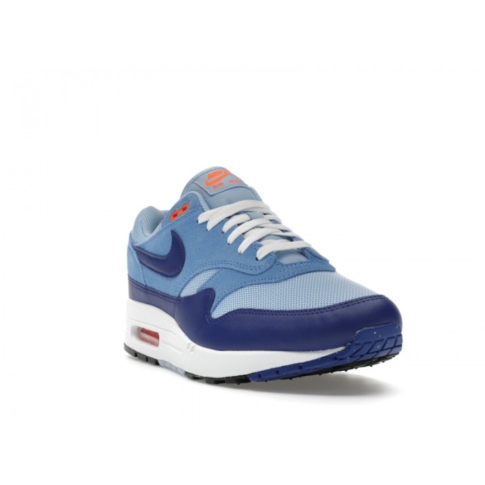 The Nike Air Max 1 Essential Psychic Blue is an athletic shoe that subtly pays homage to the New York Knicks team via its colorway.This iteration of the Air Max 1 Essential is made with a light Psychic Blue mesh upper for breathability. The mesh stands out mostly on the toe box, peeks through the sides, and around the ankle collar. University Blue suede overlays cross the upper atop the toe box, on the sides, and as the heel counter for support, while a strip of Deep Royal blue leather forms the mudguard and the small Swooshes that adorn the sides. Bright orange Nike Air branding appears both on the heel and the tongue, and the top eyestays also get a bright orange hue. The thick white midsole contains Air Max units also accented with orange, while a blue and black outsole completes the look.