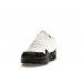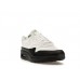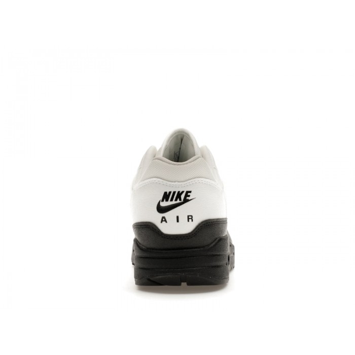 This iteration of the Nike Air Max 1 comes with an upper made of fabric and leather. White fabric makes up the top portion of the shoe, including the toe box, midsoles, and under the laces. There are white fabric overlays that also add visual interest. The Nike swoosh also appears in white on each side. The heel is also sectioned off in white and bears a black Nike Air logo. The entire bottom half of the shoe is black. A thick black mudguard can be seen running around the entire bottom of the shoe, with a wavy pattern near the arch of the foot. The rubber sole and outsole are also black, and clear transparent Air Max units are seen under the heel.