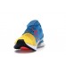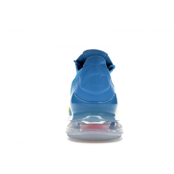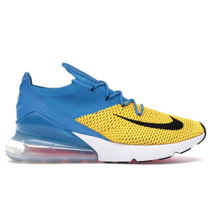 The Laser Orange Blue Orbit Nike Air Max 270 Flyknit features an upper composed of stretchy, breathable sky blue and yellow Flyknit that is both lightweight and snug. Underlying Flywire cables integrate into the eye stays, providing a secure fit. A blue leather heel tab offers support, while the tonal translucent heel counter delivers stability. A black Nike Swoosh graces the toe box for a signature style, and Air branding is subtly debossed on the heel counter and lateral overlay. A white foam midsole leaves room for a Max Air bag extending from the midfoot to the heel and rests on a black and translucent white rubber outsole.