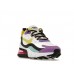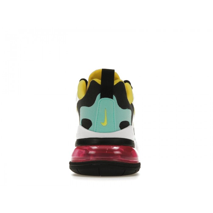 The shoes have a no-sew upper made from various materials and showcase a variety of colors including purple, yellow, and teal among others. The upper has a white base complemented by colorful accents that appear in various geometrical shapes. There’s yellow which covers the collar lining and Swoosh, purple which can be seen on the toe box, and teal which covers most of the heel area. They also have a visible air unit in the sole in typical Air Max React fashion.