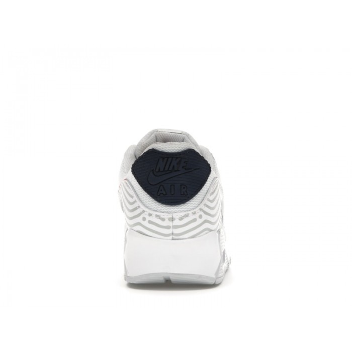 The Euro Tour iteration of the Nike Air Max 90 (2020) sports an upper of white textile with white leather overlays. These overlays are covered with reflective 3M striping for a zebra-like pattern that glows in the dark. A royal blue hit of TPU accents the upper eye stays, while navy TPU adorns the lower eye stays, a side panel window, and the heel tab with Nike branding. Red insoles feature a Nike Swoosh and a graphic of a globe to round out the theme of this upper.