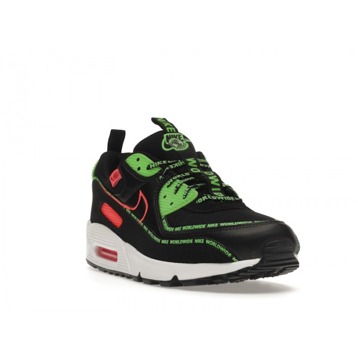 What we enjoy most about this sneaker is the green "Nike Worldwide" script that winds around the upper and dominates the black laces. The Nike Air Max 90 Worldwide Pack Black debuted November 2, 2020, for $130 retail.