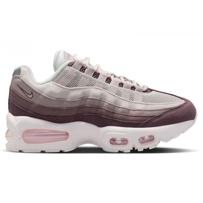 Nike Air Max 95 Phantom Silt Red (GS), артикул HF7054-012, — подростковые кроссовки из линейки Air Max 95 Big Bubble с фирменной видимой Max Air амортизацией и многослойным верхом из замши, текстиля и синтетической кожи. Колорвей Phantom/Tattoo/Moon Particle/Silt Red строится на мягком градиенте от светлого верхнего слоя к более насыщенным оттенкам в нижней части.