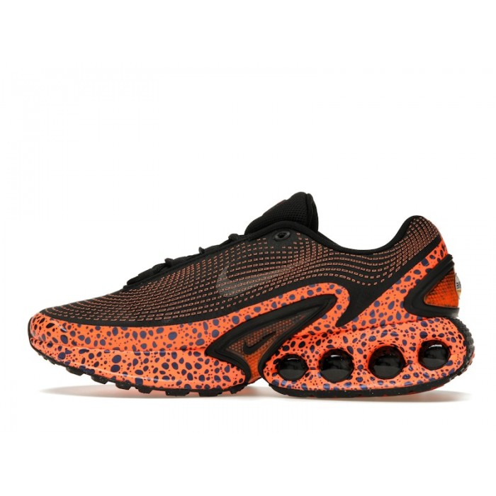 The Nike Air Max Dn SE Premium Safari revives the 1987 original with updated materials. This lifestyle shoe combines a black textile upper with orange haptic overlays, featuring a bold safari-inspired print. Inspired by African safari gear, this design honors Nike’s innovative collaboration with designer Tinker Hatfield in the late 1980s.