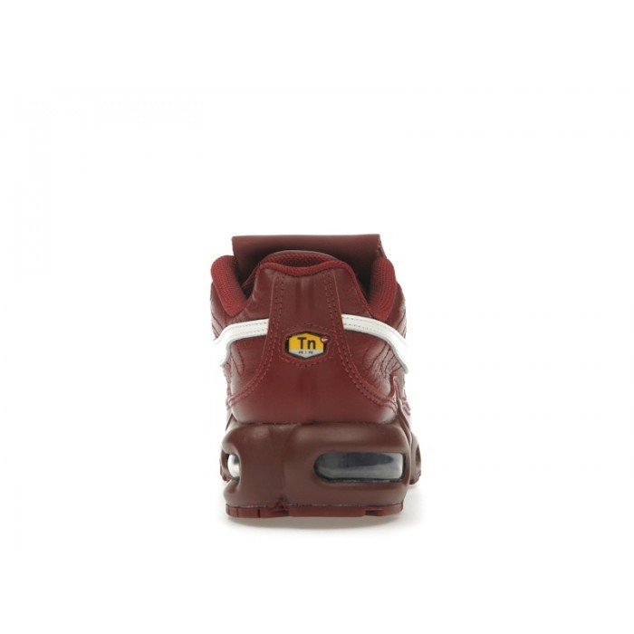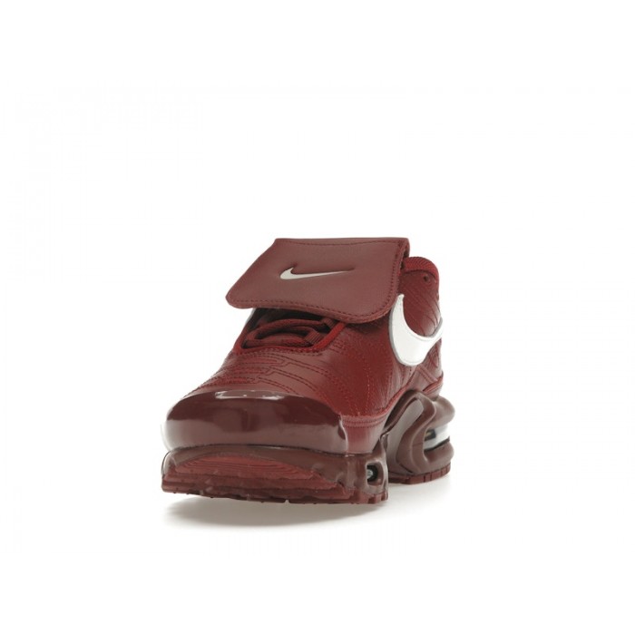 The Nike Air Max Plus Tiempo Team Red merges two Nike legends, Air Max cushioning and classic football styling, into a bold, modern hybrid with a rich Team Red and Sail colorway.