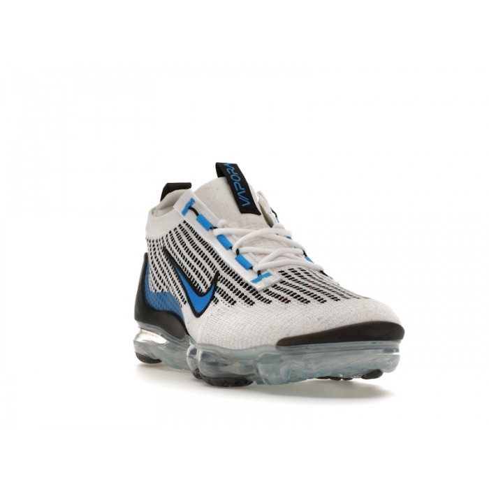 The Nike Air VaporMax 2021 Flyknit White Black Photo Blue is an athletic shoe with a bold and futuristic design.