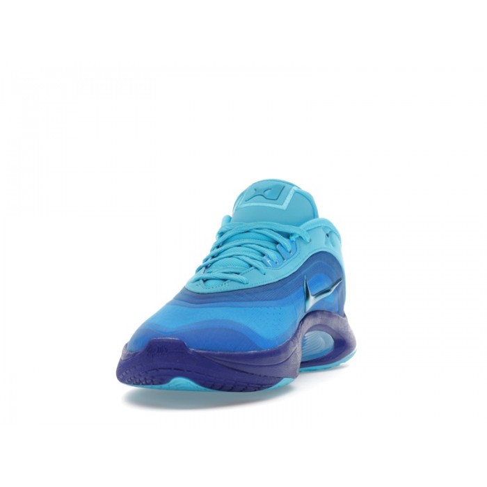 Модель представлена в уникальном градиентном синем окрасе, объединяющем оттенки Blue Fury, Racer Blue, Photo Blue и Radiant Blue. Этот колорвей плавно переходит от темно-синего к светло-голубому, создавая эффект жемчужного слоя и придавая обуви выразительный и запоминающийся вид. Персонализированные детали, такие как вышитая подпись A’ja Wilson, символические татуировки на язычке и металлический логотип Swoosh, подчеркивают индивидуальность модели и отражают личную историю спортсменки, делая ее стильным акцентом как на баскетбольной площадке, так и в повседневной жизни.